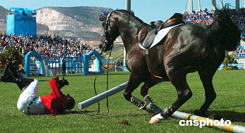 圖為阿根廷選手LUCAS WERTHEIN在當(dāng)?shù)貢r間8月24日舉行的馬術(shù)比賽中不慎從馬背上摔下來的情景。