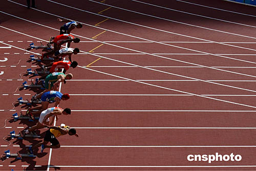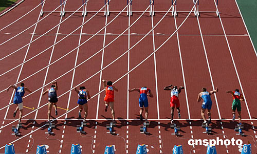 圖為在當(dāng)?shù)貢r(shí)間8月24日舉行的男子十項(xiàng)全能110米欄比賽中,選手們起跑時(shí)的鏡頭。