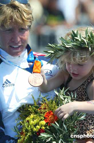 圖為美國選手威廉姆斯獲得女子鐵人三項(xiàng)銅牌后擁抱著女兒展示獎牌的場景。