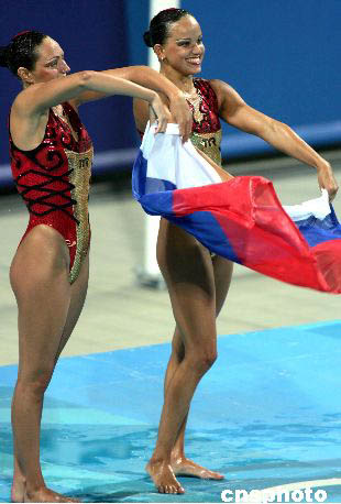 當(dāng)?shù)貢r(shí)間8月25日晚,在雅典奧運(yùn)會(huì)花樣游泳決賽中,俄羅斯選手以完美的表演和極具感染力的藝術(shù)氣質(zhì)毫無爭(zhēng)議地獲得冠軍,登上奧運(yùn)會(huì)最高領(lǐng)獎(jiǎng)臺(tái)。中新社記者:任晨鳴