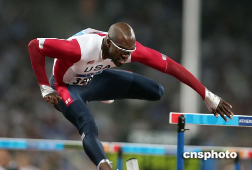 當(dāng)?shù)貢r(shí)間八月二十五日晚,在雅典奧運(yùn)會(huì)田徑男子一百一十米跨欄第二輪比賽中,美國名將約翰遜意外踩欄跌倒出局。中新社記者:毛建軍