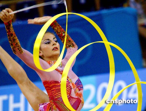 雅典當(dāng)?shù)貢r(shí)間八月二十五日,希臘藝術(shù)體操個(gè)人全能選手ANDRIOLA.E進(jìn)行奧運(yùn)會賽前排練。中新社記者:王瑤