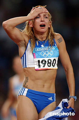 圖為希臘選手Fani Halkia在贏得女子400米欄比賽后的場(chǎng)景。
