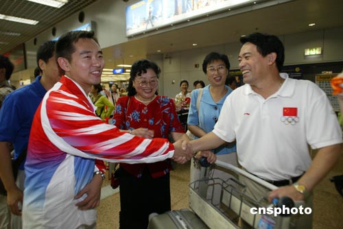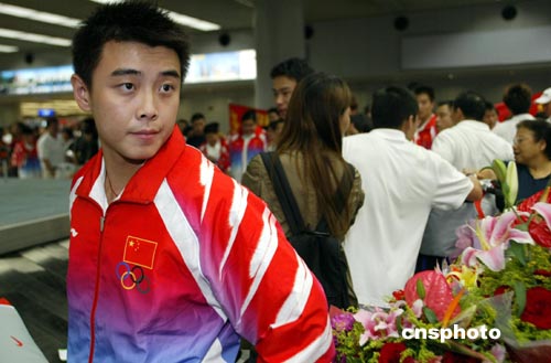 8月26日,北京首都國際機場又迎來一批載譽歸來的奧運健兒,包括羽毛球、乒乓球、游泳、體操、舉重等200多名選手,他們在機場受到英雄般的歡迎,幾乎每個人都被鮮花包圍。中新社記者:盛佳鵬