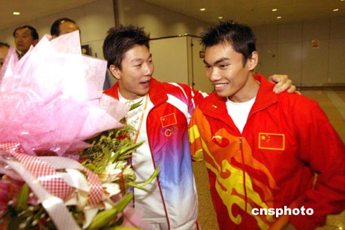 8月26日,北京首都國(guó)際機(jī)場(chǎng)又迎來(lái)一批載譽(yù)歸來(lái)的奧運(yùn)健兒,包括羽毛球、乒乓球、游泳、體操、舉重等200多名選手,他們?cè)跈C(jī)場(chǎng)受到英雄般的歡迎,幾乎每個(gè)人都被鮮花包圍。圖為中國(guó)體操名將李小鵬(左)在鮮花的簇?fù)硐屡c前來(lái)迎接的隊(duì)友梁富亮相談甚歡。中新社記者:盛佳鵬