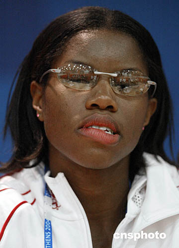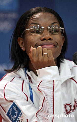加拿大選手費(fèi)利西安(Perdita Felicien)在雅典奧運(yùn)會田徑女子100米欄決賽中跨第二個欄時摔倒,沒有完成賽程。圖為她出席記者會時的鏡頭。
