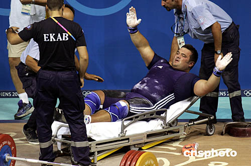 圖為挪威選手Stian Grimseth在男子105公斤級的舉重比賽中受傷被抬出場地的場面。