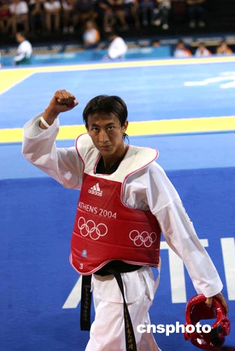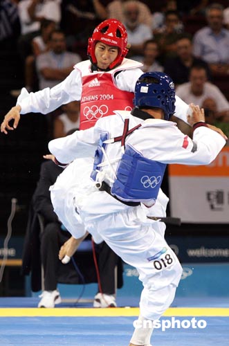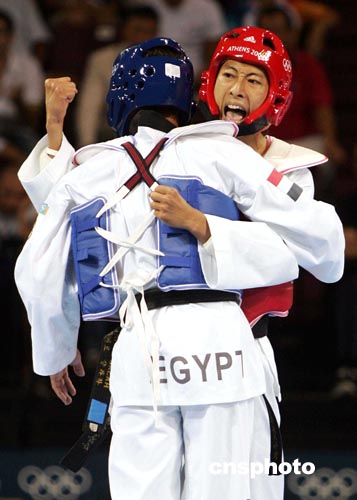 當(dāng)?shù)貢r間八月二十六日下午,在雅典奧運會男子五十八公斤級跆拳道比賽中,臺北選手朱木炎戰(zhàn)勝埃及選手殺入決賽。中新社記者:毛建軍