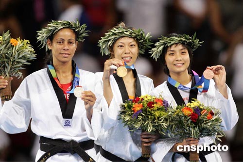 當(dāng)?shù)貢r(shí)間八月二十六日晚,在雅典奧運(yùn)會(huì)女子四十八公斤級(jí)跆拳道決賽中,中國(guó)臺(tái)北選手陳詩(shī)欣獲得金牌。這是中國(guó)臺(tái)北代表團(tuán)在奧運(yùn)歷史上的首枚金牌。中新社記者:毛建軍