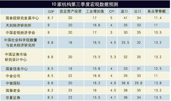 宏觀調(diào)控已經(jīng)取得明顯效果的說法得到了參與預測機構(gòu)比較一致的認同,他們對三季度各項經(jīng)濟指標的增長速度的預測明顯低于上半年,其中,對GDP增長預測的平均值為8.6%。