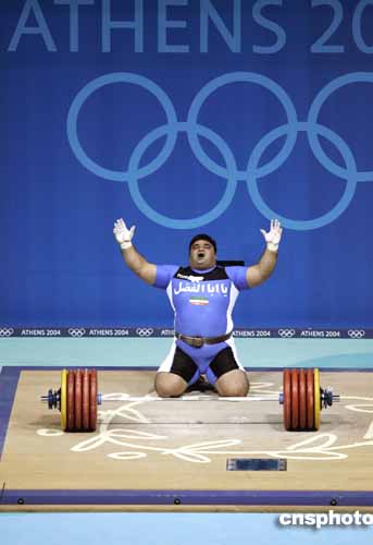 圖為伊朗選手Hossein Reza Zadeh舉起263.5公斤的重量,獲得男子105公斤以上級舉重冠軍。