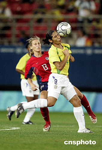 圖為美國女足隊隊員克里斯汀·莉莉(Kristine Lilly)在與巴西隊比賽中的表現(xiàn)。