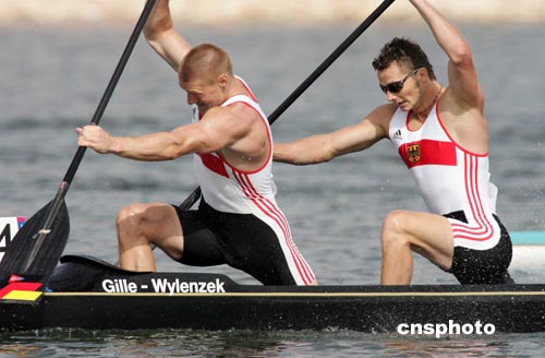 當?shù)貢r間八月二十七日,在雅典奧運會男子雙人劃艇一千米比賽中,德國選手GILLE與WYLENZEK獲得冠軍。中新社記者:毛建軍