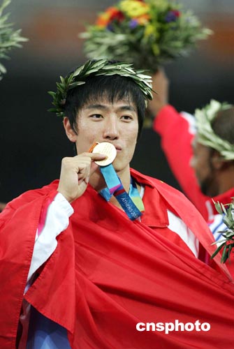 當(dāng)?shù)貢r(shí)間八月二十七日晚,在雅典奧運(yùn)會(huì)男子一百一十米欄比賽中,中國選手劉翔以十二秒九一的成績(jī)獲得冠軍并打破奧運(yùn)會(huì)紀(jì)錄。中新社記者:毛建軍