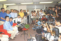民建聯(lián)主席馬力早時在內(nèi)地接受切除結(jié)腸癌手術(shù)﹐28日出院返回香港﹐民建聯(lián)中常委在總部設(shè)歡迎會﹐歡迎馬力主席手術(shù)成功返港﹐蔡素玉向馬力送花。中新社記者:趙振清