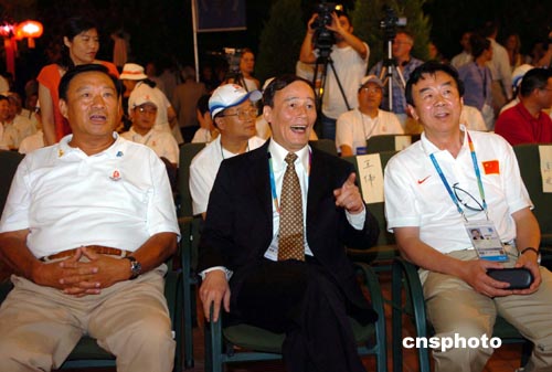 圖為北京奧運(yùn)組委會(huì)執(zhí)行主席袁偉民、王岐山和中國(guó)國(guó)家旅游局局長(zhǎng)何光暐(從右到左)在啟動(dòng)儀式上。
