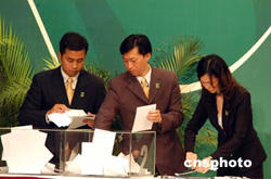 澳門(mén)特別行政區(qū)第二任行政長(zhǎng)官選舉,二十九日在澳門(mén)舉行,二百九十九名選舉委員會(huì)委員出席選舉會(huì),委員們投票后工作人員在認(rèn)真點(diǎn)票。作者:梁永強(qiáng)