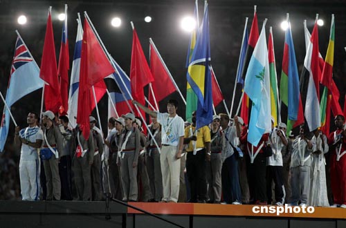 雅典當?shù)貢r間八月二十九日晚,雅典奧運會閉幕式在奧林匹克主體育場隆重舉行,在本屆奧運會奪得男子110米欄金牌的中國飛人作為中國體育代表團旗手,步入會場。中新社記者:毛建軍