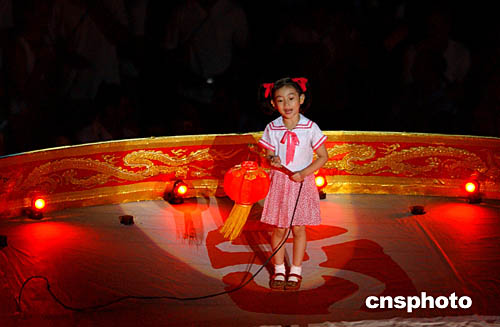 圖為在閉幕式現(xiàn)場(chǎng),中國女孩向全世界的人們發(fā)出邀請(qǐng),歡迎他們2008年到北京來的場(chǎng)面。