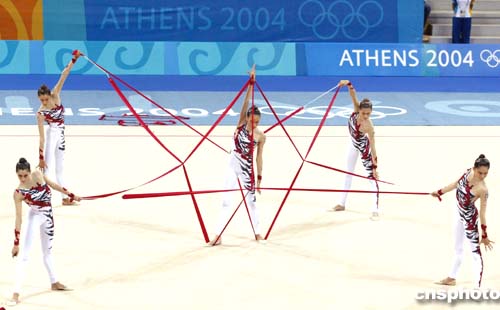 圖為意大利隊在藝術(shù)體操集體全能比賽中的精彩表現(xiàn),她們獲得該項目的銀牌。