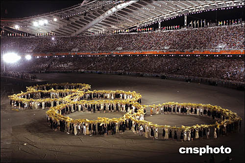 圖為在雅典閉幕式上,表演者一起組成了奧運五環(huán)的標(biāo)志。