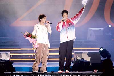 昨晚,相信出現(xiàn)在奧體中心體育場“同一首歌·為奧運(yùn)喝彩”晚會(huì)的觀眾見到的絕對是史無前例的黃金歌手組合。首先出場的是著名歌手孫楠和他的最新搭檔——中國羽毛球隊(duì)金牌教練李永波,兩位嗓音同樣出色的大腕演唱的《紅旗飄飄》,贏得滿場喝彩。青春偶像張柏芝當(dāng)晚的搭檔是萬米長跑奧運(yùn)冠軍邢慧娜。張柏芝說想親吻一下那塊金牌,邢慧娜俏皮地說:“我沒帶,不過你唱歌給我聽,我就讓你親!庇谑,兩人一同演繹了一首《星語心愿》讓大家過了把癮。之后還有孫國慶、李春波、黃鶴祥等歌手和奧運(yùn)冠軍們演繹的精彩節(jié)目。