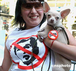 美東時(shí)間九月一日中午,家住費(fèi)城的凱羅琳娜來到紐約。她身穿在布什頭像上打了個(gè)禁行符號(hào)的T恤衫,也給小狗佩帶上反布什的掛件,在共和黨代表們準(zhǔn)備就餐的地方進(jìn)行抗議。美國共和黨全國代表大會(huì)正在紐約舉行。作者:龔文謨