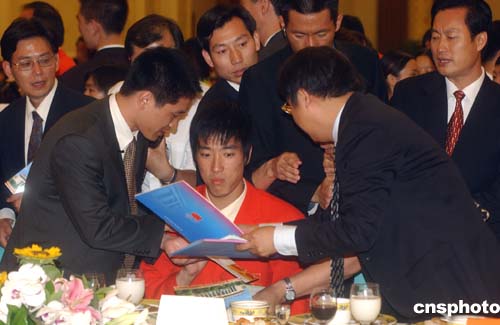 九月二日晚,中共中央辦公廳、國(guó)務(wù)院辦公廳在北京人民大會(huì)堂宴會(huì)廳舉行招待會(huì),歡迎載譽(yù)歸來的第28屆奧運(yùn)會(huì)中國(guó)體育代表團(tuán)。圖為110米欄奧運(yùn)冠軍劉翔招待會(huì)上被眾多的體育迷包圍獲取簽名。中新社記者:武仲林
