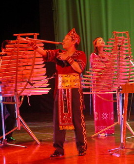 竹制樂器的演奏是越南藝術表演中獨具特色的,竹琴據(jù)介紹是仿鋼琴制成的,音色清脆,節(jié)奏明快,表演者的雙手在竹鍵上彈奏,速度快得讓觀眾眼花繚亂;德朗琴是用線將長短不一的竹筒自上而下排掛在一個琴架上,敲擊琴筒的兩根細棒頂端各固定一個圓球,球上罩著一層布,敲擊竹筒時琴聲似幽谷回響;klong put琴由一排粗細有別的竹筒制成,演奏者根據(jù)每個竹筒的固定音調,用手在筒端變換敲擊出舒緩綿長的曲調來;還有一個孔的簫,遠遠看去吹蕭人將蕭橫托在面前,用手在蕭的遠端一開一合地掌握音階,仿佛中國蕭從小孔開合變換里發(fā)出的聲音,都從越南吹蕭人的手中魔幻般地變了出來。這些樂器既有獨奏,又有合奏,兼有表演的觀賞與聽覺的雙重效果,極具藝術魅力。