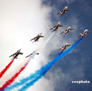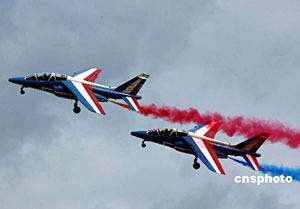 中新網(wǎng)9月7日電 日前,法國空軍飛行表演隊(duì)先遣組組長讓·馬克在北京透露,“法蘭西巡邏兵”飛行表演隊(duì)10月將隨希拉克總統(tǒng)到訪北京,在北京南苑機(jī)場舉行兩場表演,然后赴武漢、珠海、香港巡演。法蘭西巡邏兵是世界五大特級飛行隊(duì)之一,此次隨總統(tǒng)出訪是第一次。表演隊(duì)使用阿爾法噴氣教練機(jī)。此次表演由國防部外事辦公室和空軍有關(guān)單位主辦。中新社記者:鄭萍萍