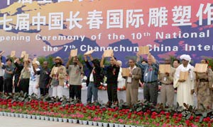 第七屆雕塑展邀請(qǐng)了二十三個(gè)國(guó)家的雕塑家現(xiàn)場(chǎng)創(chuàng)作了二十六件作品,其中有十個(gè)國(guó)家尚未與中國(guó)建交。圖為部分雕塑家獲長(zhǎng)春市政府頒發(fā)的“長(zhǎng)春杯”榮譽(yù)證書。