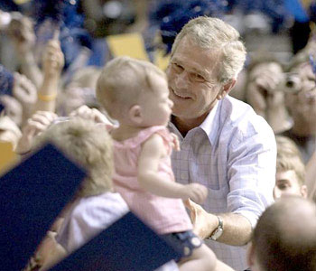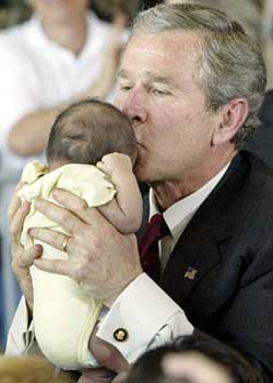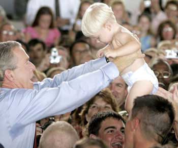 中新網(wǎng)9月5日電 據(jù)英國媒體報道,四年一度的美國總統(tǒng)大選是美國政治活動中最重要的節(jié)目。不論是共和黨,還是民主黨的總統(tǒng)候選人都會想盡一切辦法在選民面前展示自己的良好形象和領(lǐng)導(dǎo)能力。對于他們來說,選民們的“可愛貝貝”是表現(xiàn)其親和力的重要工具。以上就是媒體捕捉到的布什總統(tǒng)在競選活動中拿“可愛貝貝”作秀的精彩鏡頭。(固山)