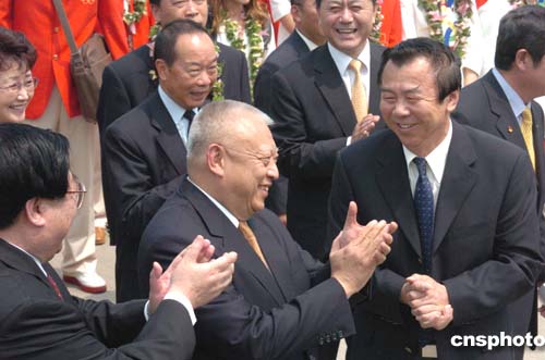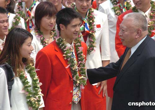 香港特區(qū)行政長(zhǎng)官董建華到場(chǎng)歡迎以袁偉民為團(tuán)長(zhǎng)的中國(guó)奧運(yùn)金牌代表團(tuán)訪問(wèn)香港。中新社記者:錢(qián)興強(qiáng)