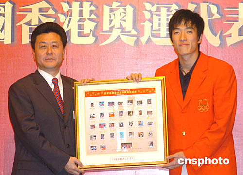 “百一米欄王”劉翔向中央駐港聯(lián)絡辦公室副主任李剛致送紀念品。