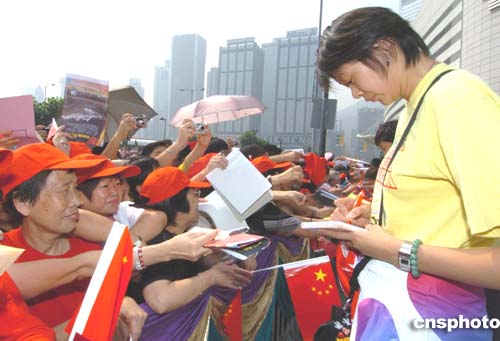 國家奧運金牌代表團(tuán)9月7日在香港展開觀光之旅,9時45分抵達(dá)灣仔金紫荊廣場參觀,吸引大批市民圍觀,圖為女排選手趙蕊蕊為熱情的香港市民簽名。作者:趙振清