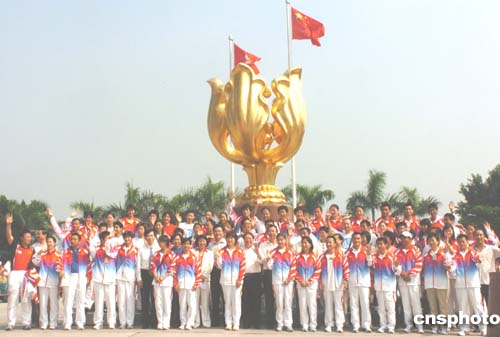 代表團(tuán)首先在金紫荊雕像前來(lái)個(gè)大合照,然后繞場(chǎng)一周,一一與在場(chǎng)市民握手和簽名,他們所經(jīng)之處,均引起一陣哄動(dòng),在場(chǎng)工作人員不停呼吁地市民注意安全和保持秩序。在烈日下,有“靚女”之稱(chēng)的女排姑娘周蘇紅、劉亞男把手都簽酸了,仍滿(mǎn)足不了熱情的球迷。代表團(tuán)逗留了約半小時(shí),在市民歡送聲中離開(kāi),繼續(xù)其他參觀訪問(wèn)。