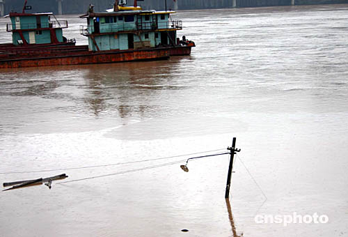 圖為重慶市渝中區(qū)化龍橋一處被淹,只剩一根電桿尚余頂部露出水面。