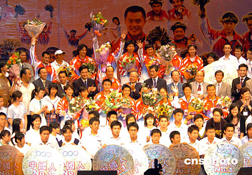 正在香港訪問(wèn)的國(guó)家?jiàn)W運(yùn)金牌代表團(tuán),九月七日來(lái)到香港沙田大會(huì)堂,參加新界各界慶委會(huì)舉行的歡迎國(guó)家?jiàn)W運(yùn)金牌代表團(tuán)嘉年華活動(dòng)。圖為新界各界人士與到訪的部分國(guó)家?jiàn)W運(yùn)金牌運(yùn)動(dòng)員一起合影。中新社記者:錢(qián)興強(qiáng)