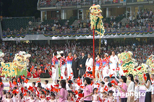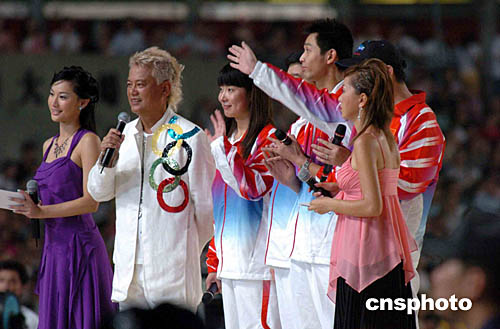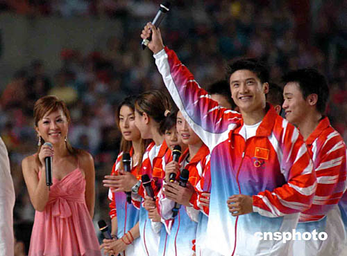 隨著金龍飛舞、銀獅歡躍,第一輛載著奧運(yùn)金牌選手的高爾夫球車(chē)駛?cè)胂愀鄞笄驁?chǎng),“中國(guó)人的驕傲──奧運(yùn)金牌精英大匯演”,在逾三萬(wàn)觀眾雷鳴潮涌般的歡呼聲中拉開(kāi)了帷幕。中國(guó)奧運(yùn)金牌選手與香港當(dāng)紅演藝明星的夢(mèng)幻組合,使今晚的香港大球場(chǎng)成為激情四溢、歡樂(lè)無(wú)盡的海洋。