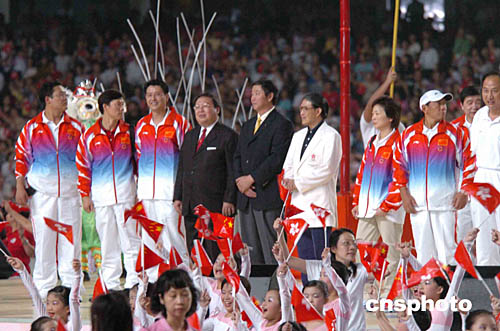 國(guó)家奧運(yùn)金牌代表團(tuán)繼續(xù)訪港第二日行程,7日晚上,五十名金牌運(yùn)動(dòng)員出席在香港大球場(chǎng)舉行的精英大匯演。圖為香港民政事務(wù)局長(zhǎng)何志平(左四)出席大匯演。作者:洪少葵