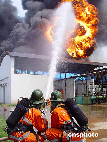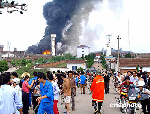 金華市立信醫(yī)藥化工有限公司地處金華市西郊,距市區(qū)十公里。起火部位為該公司五0九車間(阿奇霉素中間體生產(chǎn)車間),因反應(yīng)釜突然爆炸,引燃周圍甲苯、丙酮、甲醇和泄漏的易燃液體等,造成大火;饒鰸鉄煗L滾、燃燒猛烈,同時(shí)發(fā)生了第二次爆炸,繼而又連續(xù)發(fā)生多次爆炸,甲苯、甲醇、丙酮等化工原料泄漏燃燒散發(fā)出劇毒氣體。與起火車間相鄰的就是氫氣、溴甲烷等易燃易爆危險(xiǎn)品倉庫,極易引起連鎖爆炸,情況十分危急。