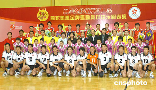 中國女子排球隊(duì)8日來到香港修頓體育館進(jìn)行表演﹐與香港男女排球隊(duì)合影留念。中新社記者:趙振清