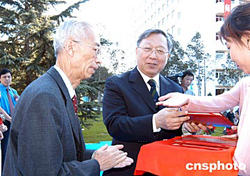中國科學院研究生院九月九日在北京玉泉路教學園區(qū)隆重舉行了二零零四級研究生開學典禮。典禮上中科院研究生院物理科學學院、化學與化學工程學院、資源與環(huán)境學院正式成立。全國人大副委員長、中國科學院院長路甬祥院士(右)為物理科學學院院長、原國家自然科學基金委員會主任陳佳洱院士頒發(fā)聘書。作者:徐曦弋