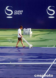 九月九日,工作人員在北京網(wǎng)球中心中央球場進(jìn)行最后的準(zhǔn)備工作。目標(biāo)為世界第五大網(wǎng)球賽事的中國網(wǎng)球公開賽將于十日開幕,包括費(fèi)雷羅、莫亞、薩芬、小威廉姆斯、莎拉波娃、李婷、孫甜甜等在內(nèi)的中外網(wǎng)球名將將參加為期十七天的比賽。中新社記者:武仲林