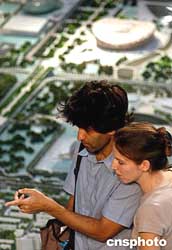 九月中旬,一對外國客人在剛落成不久的北京城市規(guī)劃展覽館內觀看大型沙盤,并仔細“閱讀”北京奧運村附近的規(guī)劃情況。北京城市規(guī)劃展覽館也將在本月展示并收藏從雅典接回的奧運會會旗。中新社記者:張宇