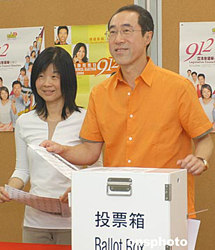 9月12日為香港第三屆立法會(huì)選舉投票日,香港財(cái)政司司長(zhǎng)唐英年偕同夫人在港島香港仔陳白沙紀(jì)念中學(xué)投票站投票。作者:鄧慶樂(lè)