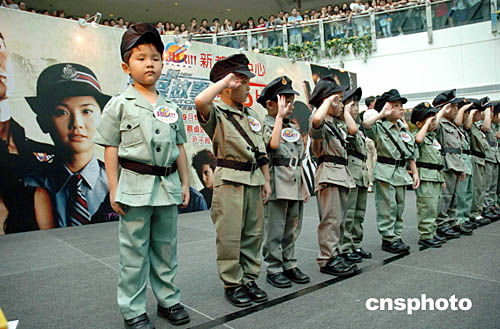 成龍作品《新警察故事》即將在香港上映,9月12日劇中一眾演員在將軍澳新都城天幕廣場舉辦的“新警察故事-激斗Show”上與觀眾游戲同樂。圖為十位小警察步操出場為活動拉開序幕。作者:洪少葵