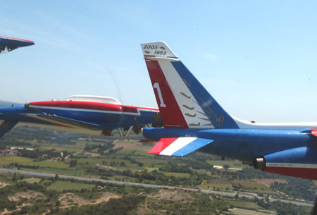 法國空軍的“法蘭西巡邏兵”飛行表演隊正式成立于1964年2月。飛行表演隊的飛機涂著同法國國旗一樣的紅、白、藍三種顏色,機群在空中做飛行表演時也常常把著三種顏色的煙跡留在空中。它象征著“自由”(紅色)、“民主”(白色)、“博愛”(藍色),體現(xiàn)了法國人民勇敢、浪漫的傳統(tǒng)和對未來美好的愿望。圖為飛行表演隊正在作精彩的飛行表演(來源:艦船知識網(wǎng)絡版)