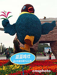 第十三屆金雞百花獎電影節(jié)將于九月十六日在寧夏首府銀川舉行。在銀川市的光明廣場,本屆電影節(jié)吉祥物、寧夏回族自治區(qū)的區(qū)鳥藍馬雞“藍藍”在花叢中異常顯眼。作者:劉呈軍