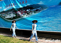 九月遼寧丹東街頭,兩位漁民裝束的女子走過“大鹿島--東方夏威夷”的巨幅掛圖。遼寧省丹東市最大的島嶼大鹿島不僅是該地區(qū)最大的活貝出口集散地,其長灘、細沙、緩坡等自然條件和甲午海戰(zhàn)等歷史遺跡形成避暑觀光的旅游勝地,當(dāng)?shù)卣畵?jù)此優(yōu)越條件大力招商引資準(zhǔn)備進行大鹿島的整體開發(fā)。中新社記者:王麗南